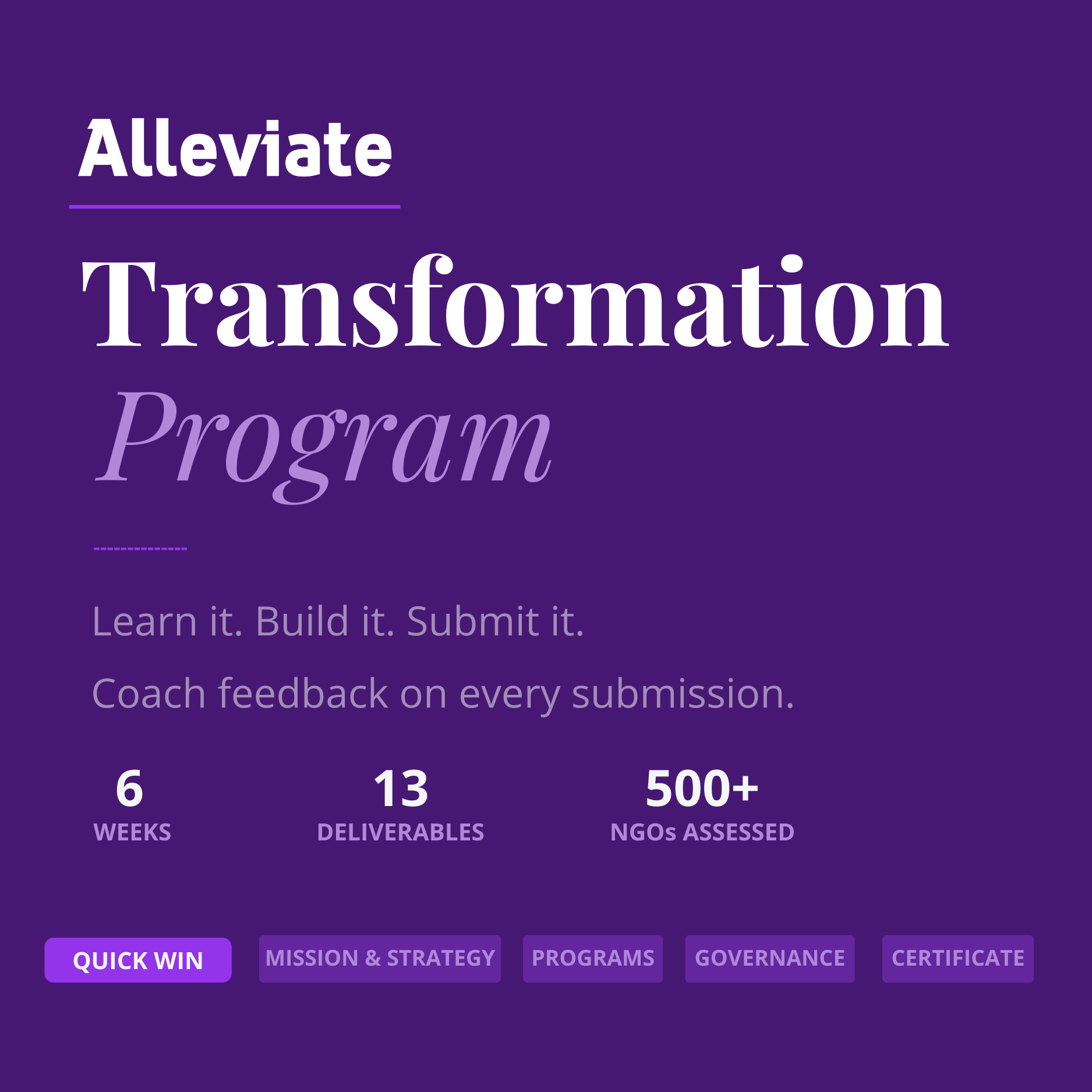 Over 6 weeks you build 13 real documents inside your Alleviate account — a LogFrame, program budget, proposal draft, Board Charter, governance checklist, and a 90-Day Transformation Plan. No busy work. No certificates for watching videos.